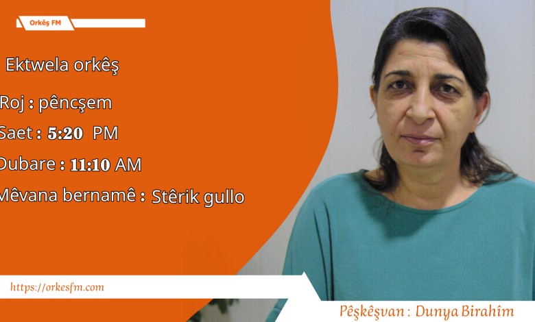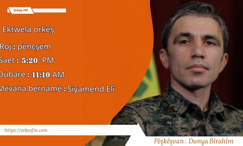 Bernama Ektwela Orkêş mijar li ser Destwerdanên Tirkiyê û Israîlê Di Sûriyê De. Pêşkêşvana bernameyê :Dunya Birahîm. Mêvanê Bernameyê : Rojnemevan Mîrxan Emadî.